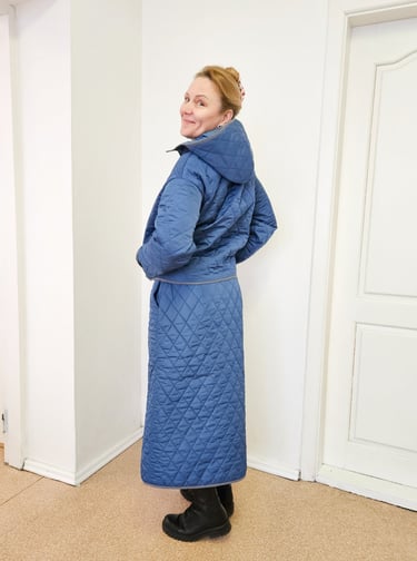 Apsiuvusi visą šeimą, atėjo laikas sau, tad Neringa pasisiuvo kostiumą iš striukinio audinio: striukę bei ilgą sijoną. Per šį projektą Neringa išmoko dirbti su kantavimo juostele! Neringa labai imli siuvimo žinioms, kruopšti ir greita. Nebijo suklysti ir moka pasijuokti iš siuvimo kliurkų
